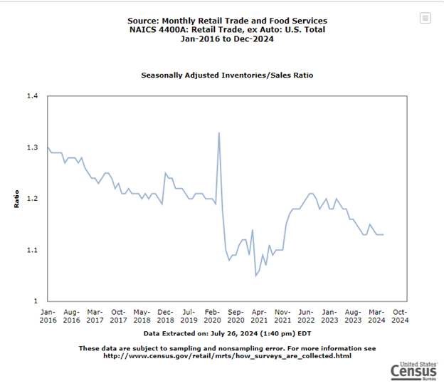 Retailer inventories largely recovered to right-sized levels in 2024, shaking off wild inventory fluctuations caused by the pandemic. In May, Census.gov data indicated that retail inventory levels were running tight at a seasonally adjusted 1.13 inventory-to-sales ratio, which measures how much companies have in stock compared to what they sell. That ratio is down from the 1.18 ratio a year earlier, and fluctuations have become less dramatic.