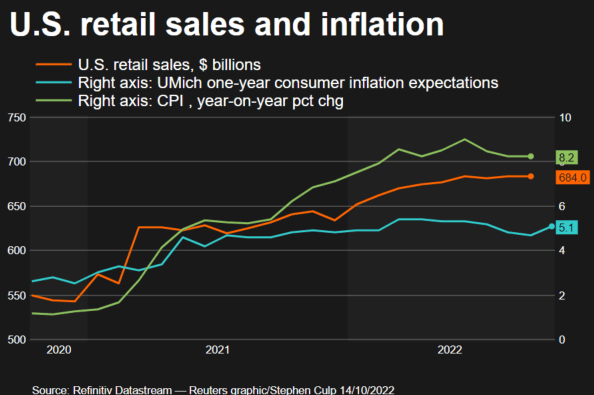 United States retail sales were flat in both August and September 2022 as consumers cut back on big-ticket spending on items like motor vehicles, electronics, and appliances. Factors driving down spending include stubbornly high inflation and rapidly rising interest rates. The GDP growth forecasts for next year according to Reuters have been slashed to 0.5%, down from 1.5% in the June forecast.