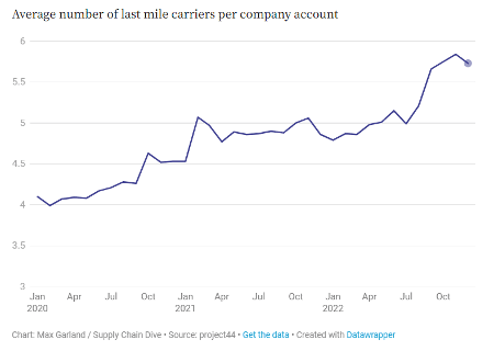 Shippers are seeking to continue diversifying their parcel carrier mix this year including adding new last mile carriers. The average number of last mile carriers per company account in December 2022 was 5.73, up from 4.86 in December 2021. The chart below shows the diversification of carriers and how it accelerated leading up to peak season 2022. Increasing rates paired with upcoming labor negotiations this summer have led to an interest in alternatives, further buoyed by increased capacity and smaller competitors with robust services.