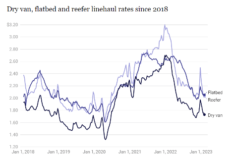 There have been few signs in the market to indicate carrier capacity is shrinking. New trucks have remained on back order for up to eight months and the price for a used truck is still twice what it was prior to 2020. Typical seasonal variance in rates is expected for the back half of 2023 unless supply reduces meaningfully, or demand has a significant increase.