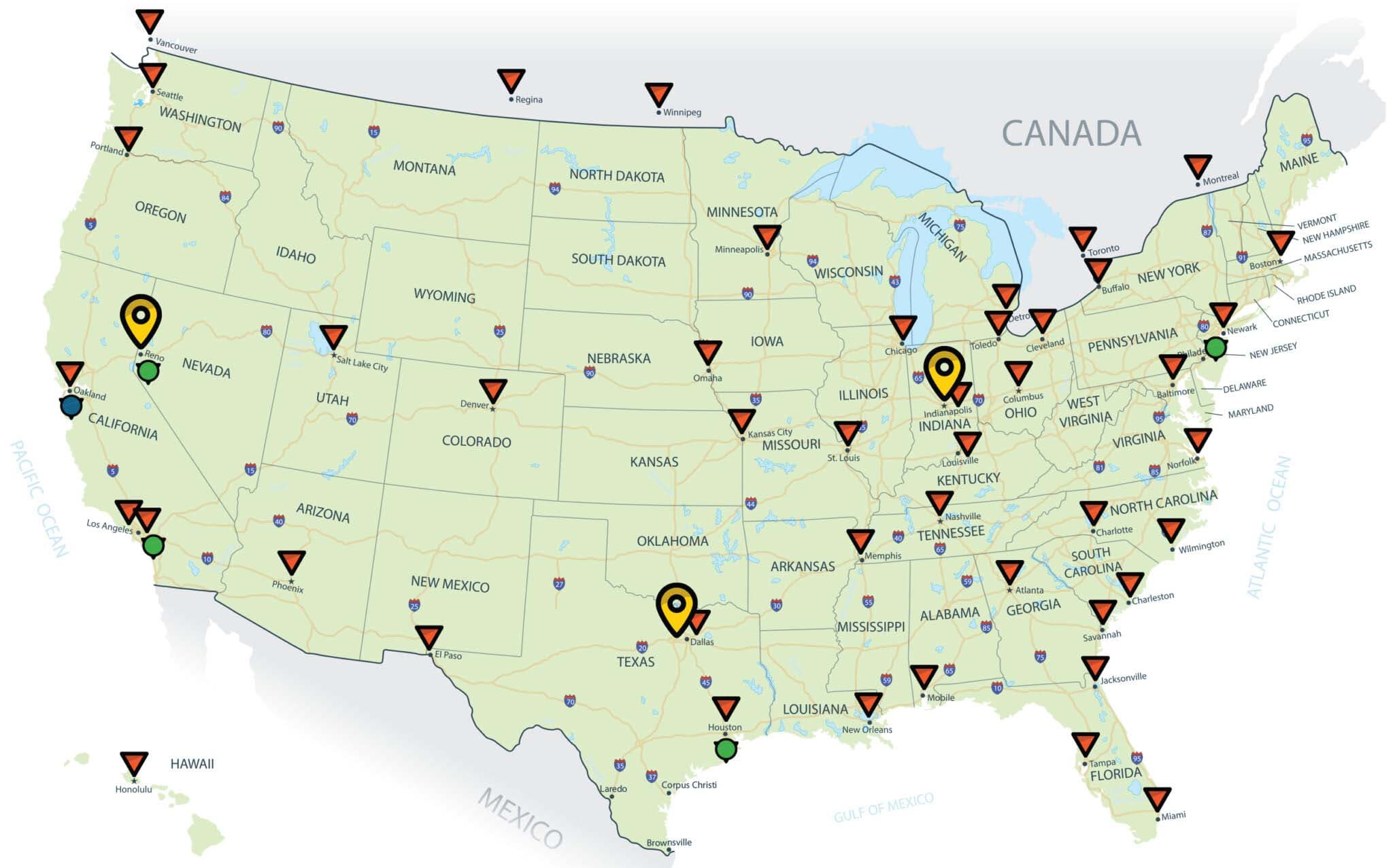 A diversified distribution and fulfillment network with multiple nodes can allow businesses to reach more customers in less time. A Midwest distribution center offers significant advantages for operations, particularly in Indianapolis, Indiana. Indianapolis’ central location provides ready access to national and international highways, able to reach 75 percent of the United States and Canadian populations in less than two days and more than 110 million people within a day’s drive. When paired with a strategically located west coast distribution center or warehouse, more than 90 percent of the US population can be reached within two days.